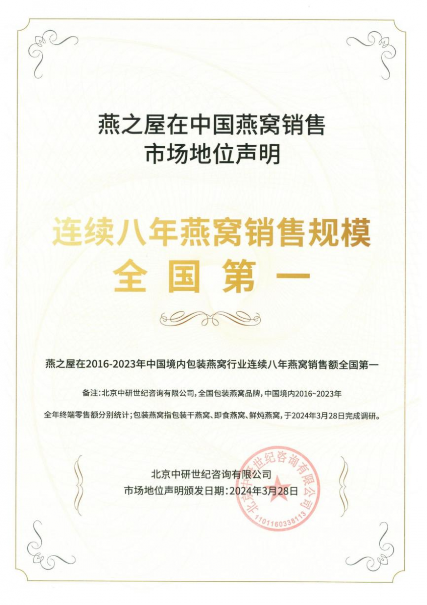 圖:燕之屋在2016-2023年中國(guó)境內(nèi)包裝燕窩行業(yè)連續(xù)八年燕窩銷售額全國(guó)第一
