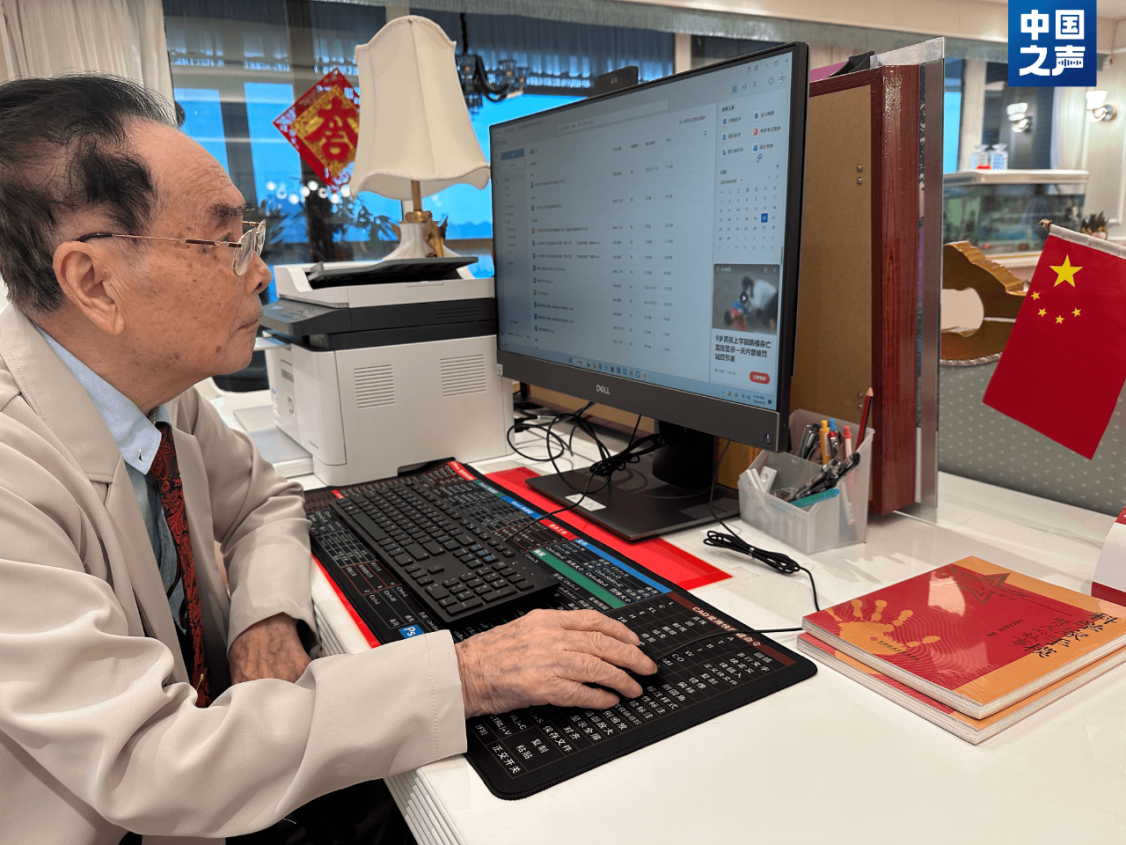 圖:95歲的侯云德每天在電腦前學(xué)習(xí)新知識和進(jìn)行學(xué)術(shù)創(chuàng)作