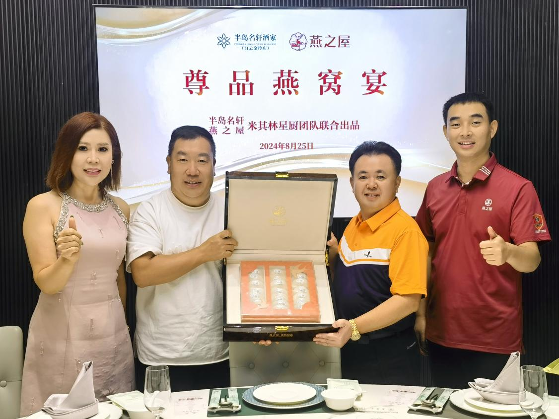 燕之屋26年專注高品質(zhì)燕窩,秉承“一碗好燕窩,滋潤天下人”的品牌初心,以前沿科技創(chuàng)新燕窩滋養(yǎng)體驗,以高品質(zhì)產(chǎn)品和服務(wù)滿足消費者多元需求,引領(lǐng)更多人步入燕窩賦予的美與健康生活方式。2021年,燕之屋成為中國國家擊劍隊指定燕窩產(chǎn)品;2023年,燕之屋于港交所成功上市(股票代碼:01497.HK),贏得市場的喜愛與信賴。半島名軒酒家(白云金控店)是半島餐飲管理集團(tuán)有限公司投資經(jīng)營、米其林星廚團(tuán)隊主理的一家品牌粵菜食府,以美饌珍饈、優(yōu)質(zhì)服務(wù)、愜意環(huán)境為賓客提供高品位餐飲新體驗。燕之屋與半島名軒酒家(白云金控店)牽手,是粵菜風(fēng)味與中式滋補的碰撞,是精奢格調(diào)與藝術(shù)審美的疊加,二者匠心錘煉呈獻(xiàn)一場尊品燕窩宴,打造宴請尊貴賓客的至高禮遇。