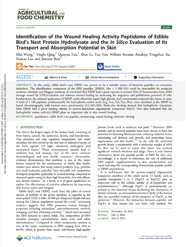燕之屋多年來(lái)致力于燕窩肽的研發(fā),挖掘燕窩肽功效與價(jià)值。2022年1月,燕之屋正式成立燕窩肽研究中心,開(kāi)拓品牌在燕窩肽酶解技術(shù)、活性成分與功能研究、消費(fèi)品研發(fā)、標(biāo)準(zhǔn)化等方向的新賽道,從制備工藝到活性研究均取得了顯著進(jìn)展和突破,其研究成果已刊登于多個(gè)國(guó)際權(quán)威期刊。2021年,燕之屋燕窩研究院和江南大學(xué)食品科學(xué)與技術(shù)國(guó)家重點(diǎn)實(shí)驗(yàn)室聯(lián)合完成燕窩肽美白功能研究,成果“A study on the skin whitening activity of digesta from edible bird's nest: A mucin glycoprotein”發(fā)布于權(quán)威學(xué)術(shù)性期刊《Gels》;2022年,燕之屋燕窩研究院攜手香港科技大學(xué)攜手完成燕窩肽抗皮膚炎癥功能研究,成果“Edible bird’s nest, an Asian health food supplement, possesses anti-inflammatory responses in restoring the symptoms of atopic dermatitis: An analysis of signaling cascades”發(fā)布于權(quán)威學(xué)術(shù)性期刊《Frontiers in Pharmacology》;2023年,燕之屋聯(lián)合華南理工大學(xué)開(kāi)展的燕窩肽皮膚修護(hù)功能的研究“Identification of the Wound Healing Activity Peptidome of Edible Bird‘s Nest Protein Hydrolysate and the In Silico Evaluation of Its Transport and Absorption Potential in Skin”被食品科學(xué)領(lǐng)域國(guó)際權(quán)威SCI收錄期刊《Journal of Agricultural and Food Chemistry》正式收錄;2024年,燕之屋深入挖掘了燕窩肽的美白作用機(jī)制,論文“Edible bird's nest peptide (EBNP) with high whitening activity: Sequences analysis, whitening activity characterization and molecular docking study”發(fā)表于SCI收錄期刊《Journal of Functional Foods》。這些科研成果不僅體現(xiàn)了燕之屋在該領(lǐng)域的長(zhǎng)期積累和深入探索,也彰顯了其對(duì)科研工作的重視與持續(xù)投入,充分展現(xiàn)了其在食品科學(xué)領(lǐng)域的雄厚實(shí)力和高水平研究能力。