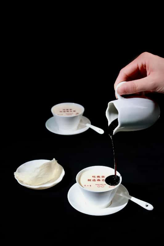 阿膠燕窩發(fā)酵酸奶酪,山東阿膠、燕之屋燕窩與驢奶三種珍稀食材創(chuàng)意融合,經(jīng)24小時發(fā)酵沉淀成絲滑酸奶酪,頂部搭配酒糟阿膠,入口絲滑綿密,透出絲絲膠香,滋養(yǎng)與口感雙重升華。這一款甜品則跳脫中餐語境,是對“滋養(yǎng)”概念最當(dāng)代表達的寫照,跨越時空的食材協(xié)奏,正是王浩全對“滋補”理念的重釋。