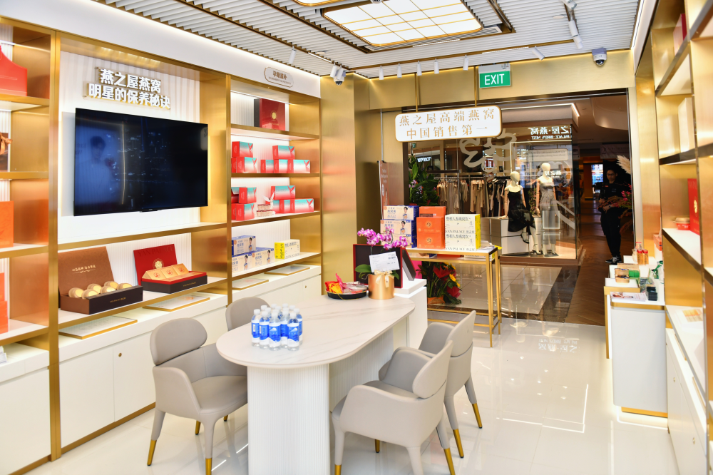 燕之屋新加坡專賣店落戶烏節(jié)路義安城,這里是新加坡知名商業(yè)購物中心,匯聚全球高端品牌與潮流風(fēng)尚,深受本地居民以及游客的喜愛。選址于這一商業(yè)地標(biāo),不僅依托其龐大客流量與國際化消費(fèi)場(chǎng)景,更通過品牌與高端商業(yè)生態(tài)的深度綁定,進(jìn)一步鞏固其燕窩行業(yè)“領(lǐng)頭燕”的形象,彰顯了燕之屋進(jìn)軍高端市場(chǎng)的決心。作為燕之屋新加坡首店,燕之屋新加坡專賣店空間設(shè)計(jì)以“燕屋”為靈感載體,將金絲燕棲居的自然智慧與燕之屋對(duì)品質(zhì)的極致追求充分融合。門頭采用中英文雙語標(biāo)識(shí),既展現(xiàn)品牌植根中華養(yǎng)生文化的底蘊(yùn),亦傳遞其擁抱全球化市場(chǎng)的開放姿態(tài)。