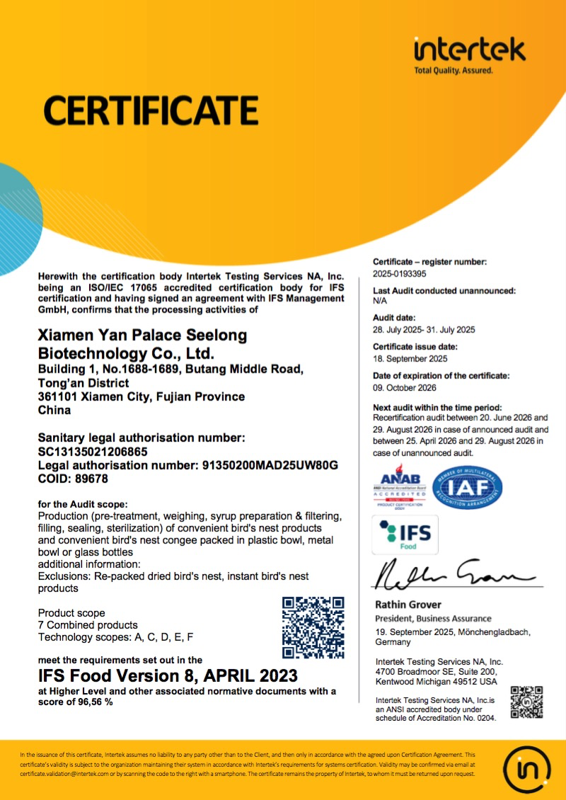 圖:燕之屋獲得BRC食品安全全球標(biāo)準(zhǔn)、IFS國際食品標(biāo)準(zhǔn)雙重認(rèn)證