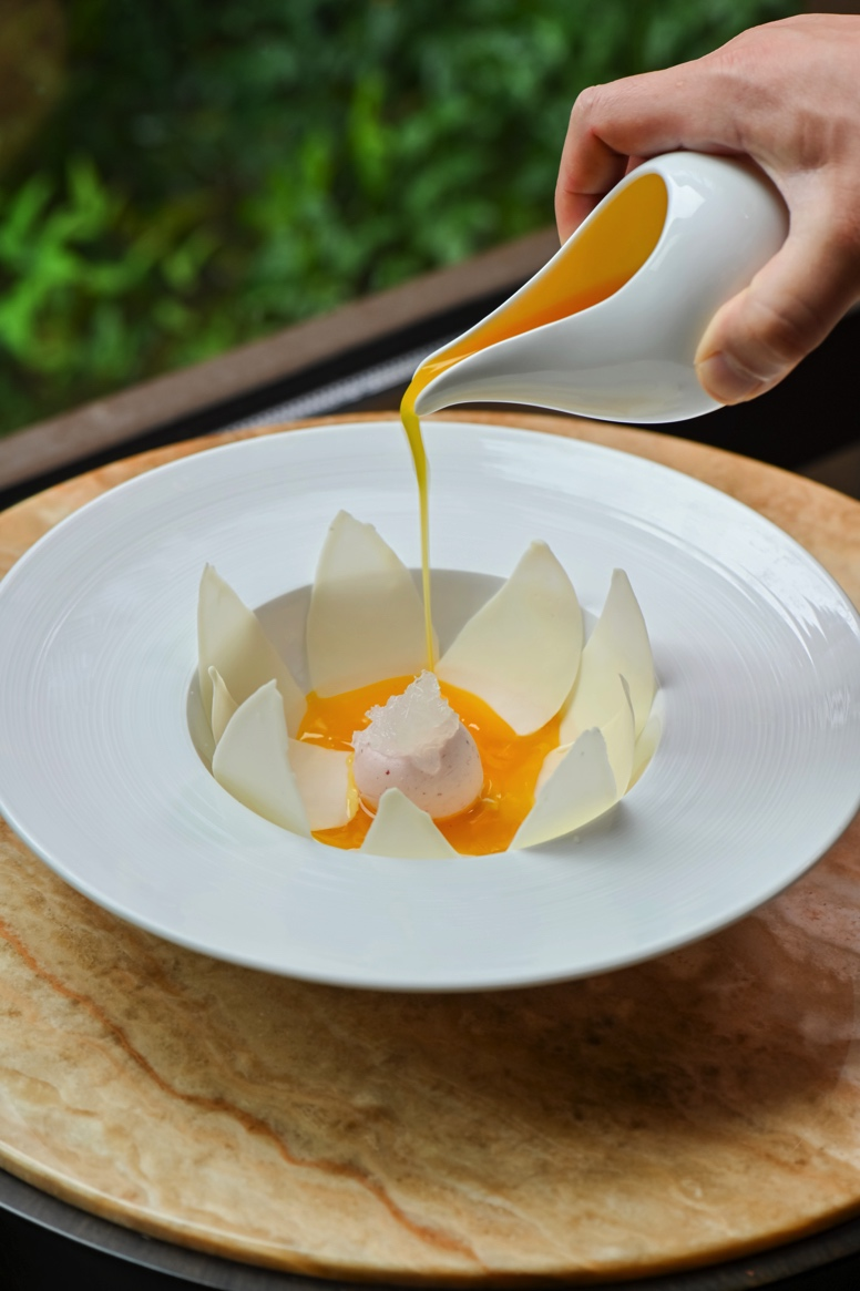玉蘭花開(kāi)映燕盞,是一道展現(xiàn)廚藝美學(xué)的匠心之作。白巧克力制成花瓣,包裹草莓慕斯花心,在溫潤(rùn)芒果汁液的澆淋下仿若漸次綻放。燕窩藏于花蕊,細(xì)膩口感與靈動(dòng)形態(tài)共同演繹出食境合一的東方意境。