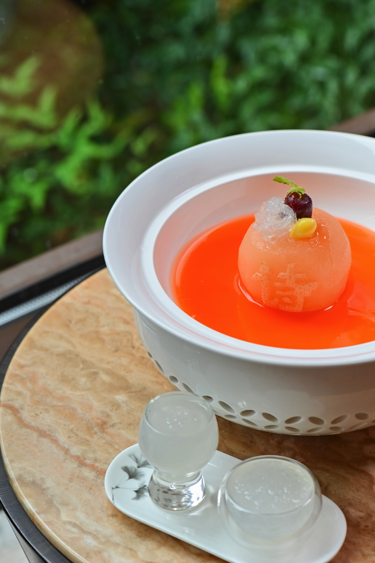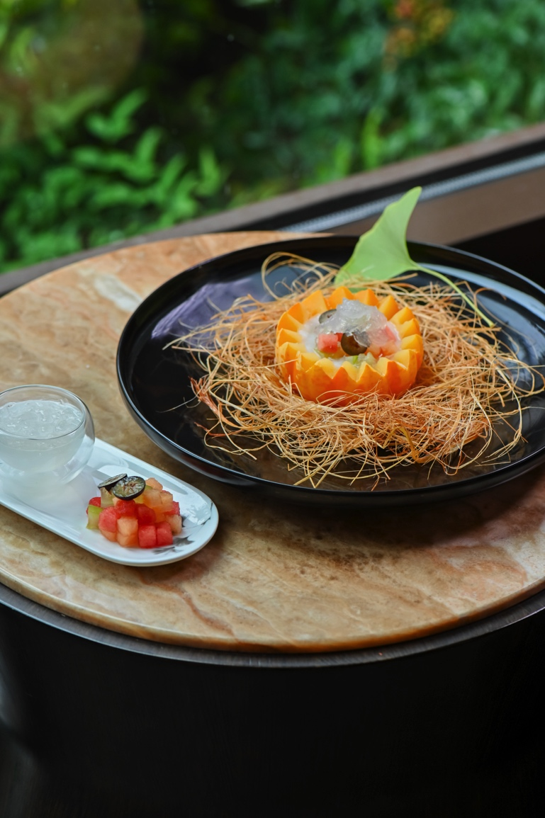 金巢玉露應(yīng)燕歸,取形制優(yōu)美的菊瓜為器,蒸至甘軟后注入香濃椰奶,綴入繽紛鮮果與晶瑩燕窩。瓜體的清甜與椰韻的馥郁相融,燕絲穿梭其間,營(yíng)造出豐富而和諧的味覺(jué)體驗(yàn),寓意金秋歸巢,溫潤(rùn)養(yǎng)人。